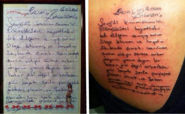 Henüz çocuk yaşlarındayken babasını toprağa veren Ecem Özütemiz, Kıvırcık Ali'nin yıllar önce hatıra defterine yazdığı satırları dövme yaptırdığını belirtti. Özütemiz’in dövme yaptırdığı satırlarda ise şunlar yazıyor: