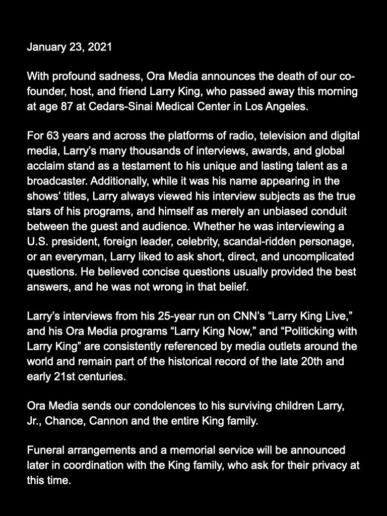 Larry King'in resmi açıklama sitesinden gelen haber.