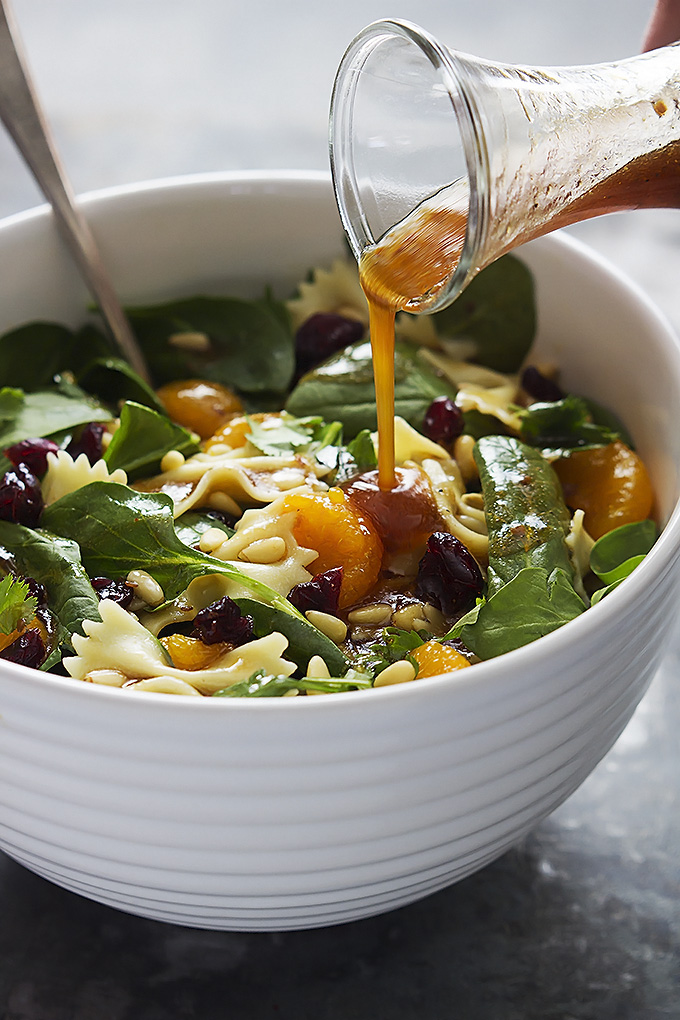 makarnayı haşlayıp süzün. üzerine dilediğiniz yeşillikleri, ardından kayısıları, kuş üzümü ve dolmalık fıstıkları ekleyip karıştırın. ayrı bir kasede yarım limon suyu, zeytinyağı ve tuzu karıştırın. makarnanın üzerine ilave ederek servis edin.