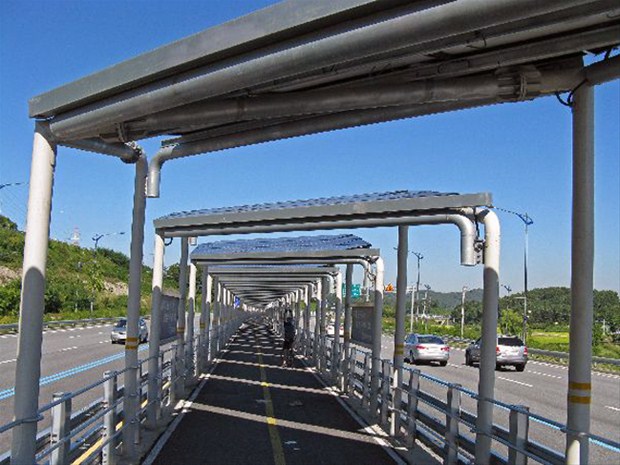 Aynı zamanda, güneş panellerinin altında bisiklet yolu bulunmakta ve bisikletçileri güneş ve yağmurdan korumakta.