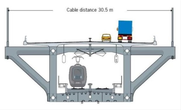 İki katlı köprünün üst bölümünde dört şeritli bir karayolu, alt bölümünde iki şeritli bir demiryolu hattı bulunur.