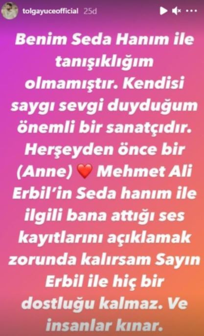 Mehmet Ali Erbil ise yaşanan bu olayların üzerine yaptığı bir açıklamada: "Seda ile birlikte yemek yiyeceğiz, bize yakışmaz küslük. İkinci, üçüncü şahıslar tahrik etti bizi. Bu dostluk öyle kolay kolay bozulmaz" dedi.