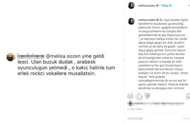 Ünlü oyuncu melisa sözen, kendisine yapılan siber zorbalığa kayıtsız kalmayarak takipçisinin yorumunu ifşa etti.