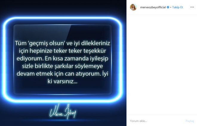Güzel şarkıcı, ınstagram hesabında yaptığı paylaşımla kendisine geçmiş olsun dileklerinde bulunan hayranlarına teşekkür ederek şunları söyledi: