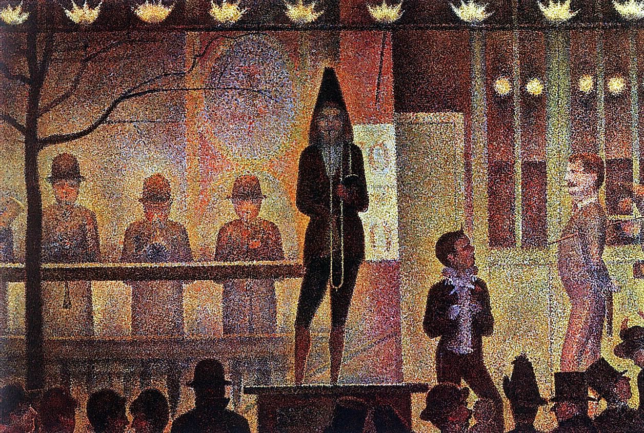 Pointilist yönteminin atası georges seurat imzalı la parade du cirque (sirk geçidi), sanatçının fırça ucu ile noktalar durumunda gerçekleştirdiği eserler arasında önemli yere sahip.