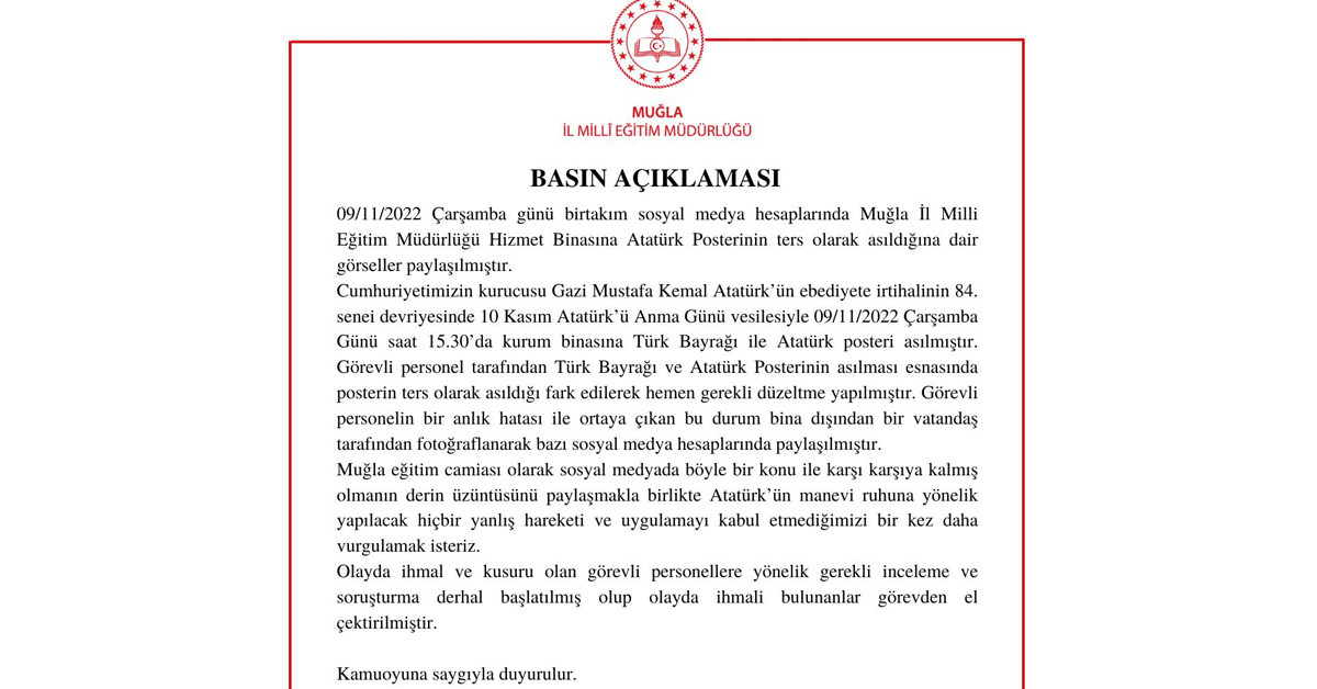İl Milli Eğitim Müdürlüğü konu hakkında, "Muğla İl Milli Eğitim Müdürlüğü'nce yapılan açıklamada 09/11/2022 Çarşamba günü bir takım sosyal medya hesaplarında Muğla İl Milli Eğitim Müdürlüğü Hizmet Binasına Atatürk Posterinin ters olarak asıldığına dair görseller paylaşılmıştır. Cumhuriyetimizin kurucusu Gazi Mustafa Kemal Atatürk'ün ebediyete irtihalinin 84. senei devriyesinde 10 Kasım Atatürk'ü Anma Günü vesilesiyle 09/11/2022 Çarşamba Günü saat 15.30'da kurum binasına Türk bayrağı ile Atatürk posteri asılmıştır" açıklamasında bulundu.