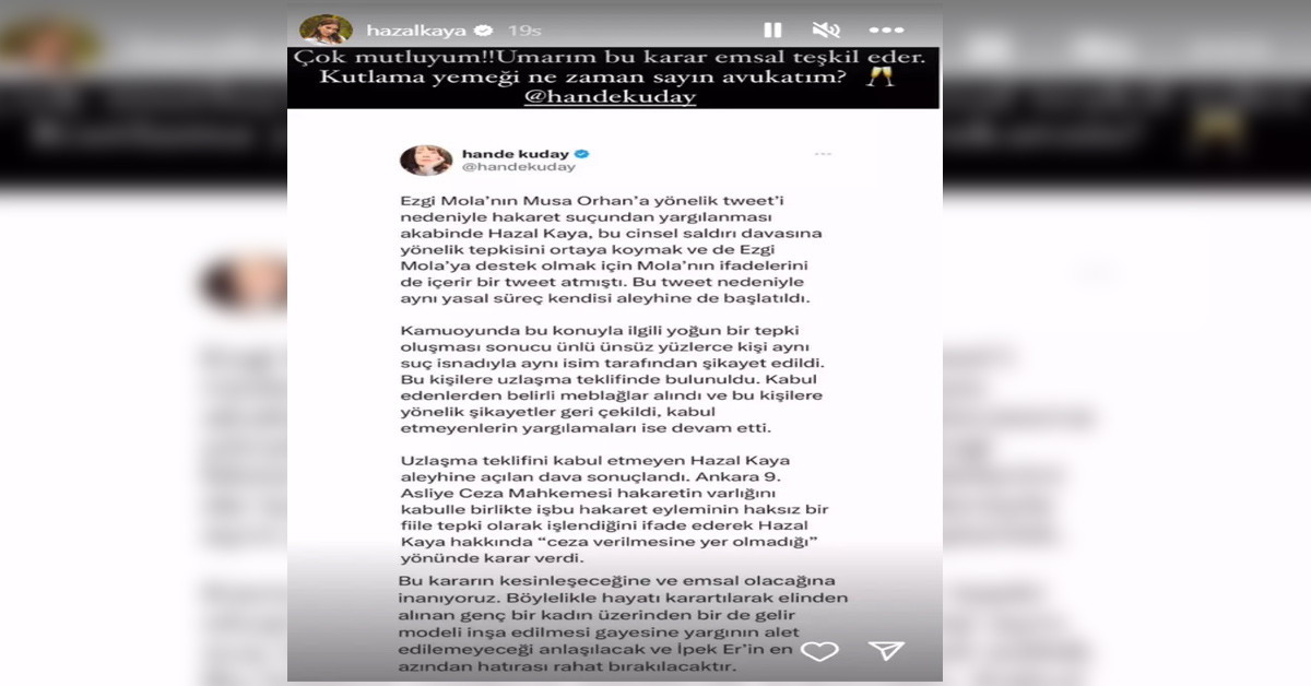 Hazal Kaya'nın avukatı Hande Kuday paylaşımında şu ifadelere yer verdi: