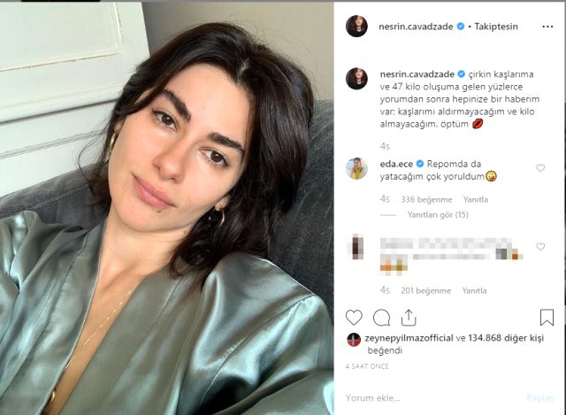 'çirkin kaşlarıma ve 47 kilo oluşuma gelen yüzlerce yorumdan sonra hepinize bir haberim var; kaşlarımı aldırmayacağım ve kilo almayacağım. öptüm'