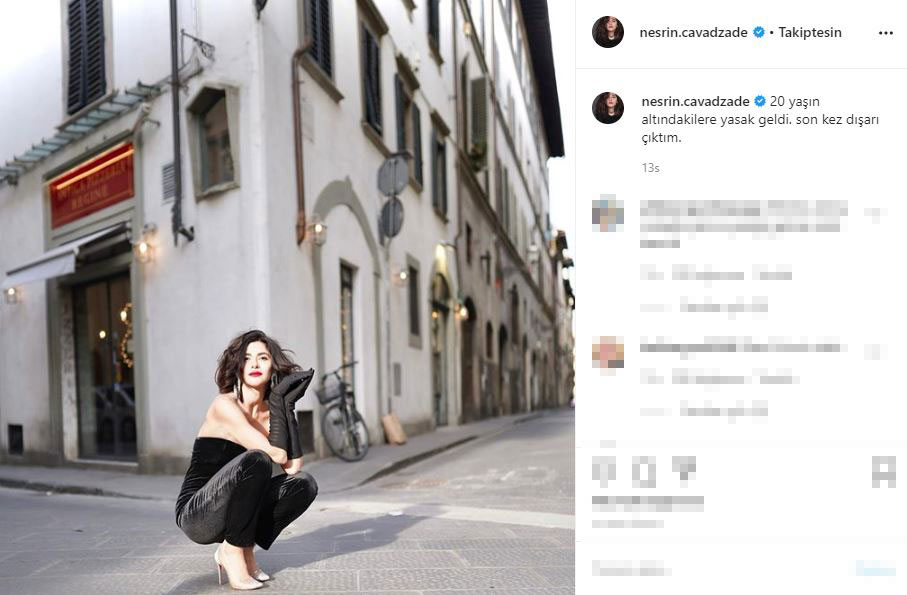 Instagram sayfasında bir fotoğraf yayınlayan nesrin cavadzade, paylaşımının altına “20 yaşın altındakilere yasak geldi. son kez dışarı çıktım” notunu ekledi.