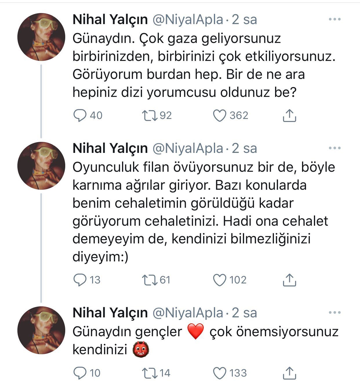 Nihal yalçın ise twitter hesabından yaptığı eleştirileri ile dikkat çekti. nihal yalçın’ın, twitter’da yaptığı o eleştiri: çok gaza geliyorsunuz. birbirinizi çok etkiliyorsunuz. ne ara, hepiniz dizi yorumcusu oldunuz be? oyunculuk filan övüyorsunuz. böyle karnıma ağrılar giriyor. bazı konularda cehaletinizi görüyorum. cehalet demeyeyim de, kendinizi bilmezliğinizi diyeyim. çok önemsiyorsunuz kendinizi.