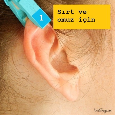 Kulağınızın en üstündeki nokta sırt ve omuz ağrılarının tedavisinde kullanılıyor. bu bölgeye 1 dakikalığına mandal sıkıştırın. bilim insanları akupunkturun nasıl işe yaradığını tam olarak açıklayamıyorlar. ancak bilinen bariz bir gerçek var ki o da bu yöntem sayesinde ağrıların geçmesine yardımcı olan endorfinin salgılandığı.