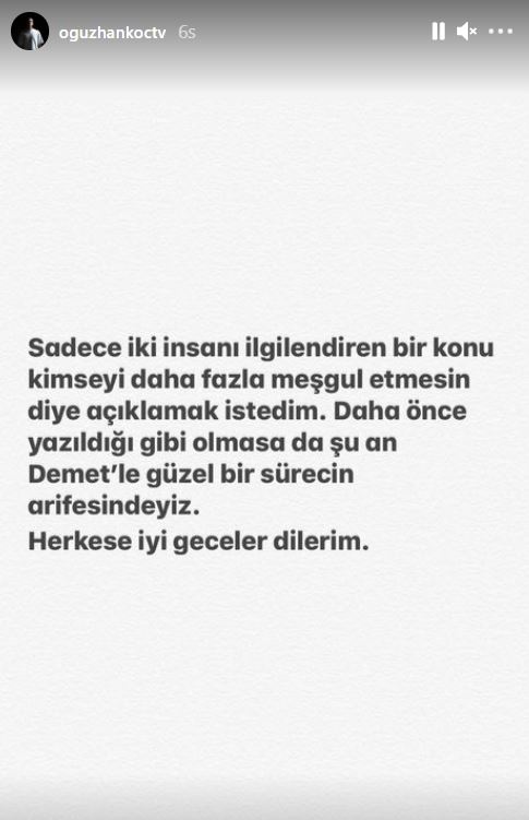 ‘Sadece iki insanı ilgilendiren bir konu kimseyi daha fazla meşgul etmesin diye açıklamak istedim. Daha önce yazıldığı gibi olmasa da şu an Demet'le güzel bir sürecin arifesindeyiz. Herkese iyi geceler dilerim’