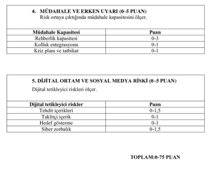 Uygulamanın önemli başlıklarından biri de erken uyarı göstergeleri olacak. Öğrencilerde şiddet eğilimini işaret edebilecek davranış değişimleri, sosyal uyum sorunları ve Sosyal Medya üzerinden yapılan tehdit içerikli paylaşımlar risk takibinde dikkate alınacak. Bu veriler, olay yaşanmadan önce önleyici tedbir alınması amacıyla değerlendirilecek.