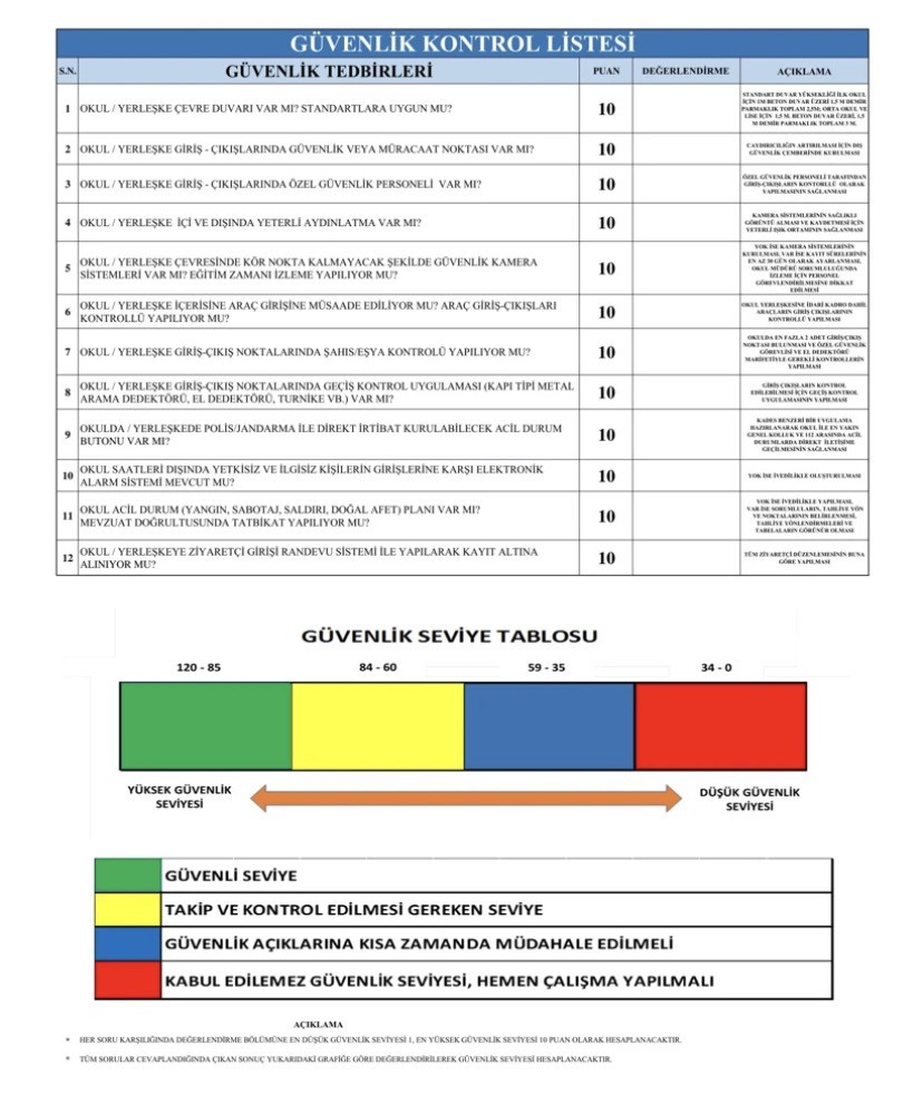 Hazırlanan protokol kapsamında okullar için Okul Güvenliği Risk Değerlendirmesi yapılacak. Okul ve çevresindeki tehdit unsurları, güvenlik ölçeği üzerinden analiz edilecek; risk düzeyi yüksek çıkan okullarda ilave tedbirler öncelikli olarak uygulanacak. Risk analizlerinde yalnızca okul içi veriler değil, bölgedeki sosyo-ekonomik yapı, göç yoğunluğu ve çevresel riskler de dikkate alınacak.