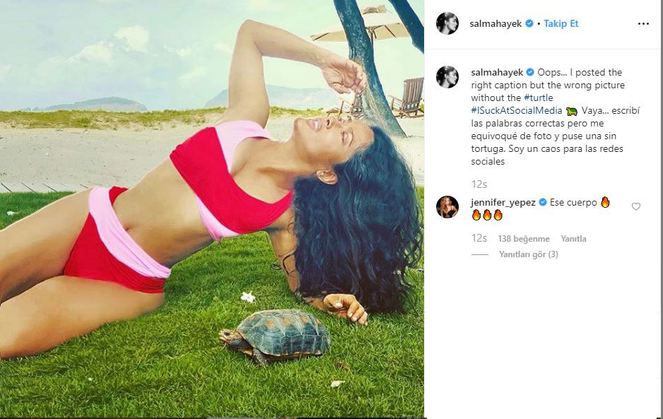 Ancak ünlü oyuncunun fotoğrafında kaplumbağa olmaması dikkatli takipçilerinin gözünden kaçmadı. gelen yorumların ardından hayek, paylaşımı silmek yerine birkaç saat sonra yanında kaplumbağa olan başka bir pozunu yayınladı.