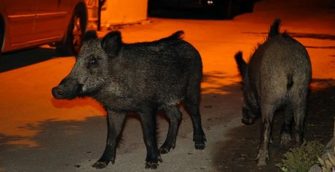 Kendilerini fark eden köpeklerin havlamalarına aldırış etmeden etrafta gezinen domuzlar, piknikçilerin bıraktığı yiyecek artıklarıyla karınlarını doyurdu. O sırada, domuzlardan biri kendilerine havlamaya devam eden köpeklere doğru koştu. O anlar, bir vatandaş tarafından cep telefonuyla görüntülendi.