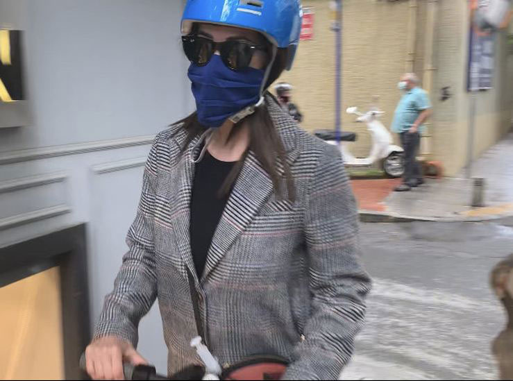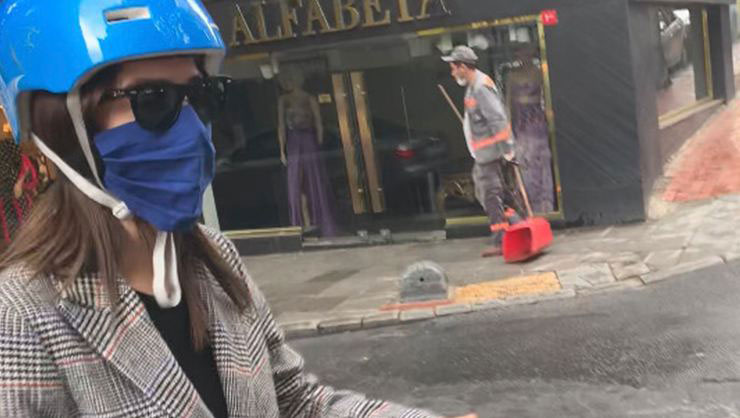 Scooter ile yolculuk yapan irem sak’ın kazalara karşı motorcu kaskı takması dikkatlerden kaçmadı. öte yandan sak, coronavirü salgınına karşı maske takmayı da ihmal etmedi.