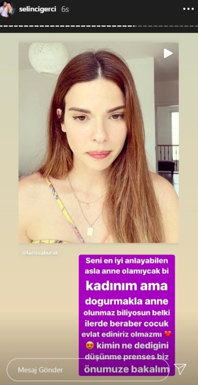 Larissa gacemer'in videosunu sosyal medya hesabının hikaye bölümünden paylaşan ciğeri, 'seni en iyi anlayabilen asla anne olamayacak bir kadınım. doğurmakla anne olunmaz biliyorsun. belki ilerde beraber çocuk evlat ediniriz olmaz mı? kimin ne dediğini düşünme prenses biz önümüze bakalım.' ifadelerini kullandı.
