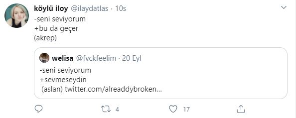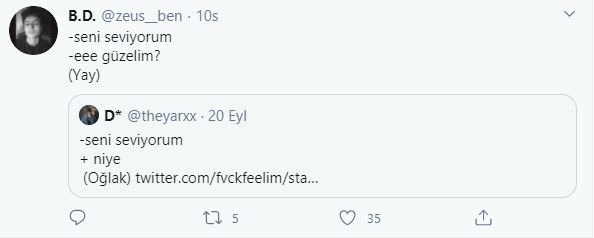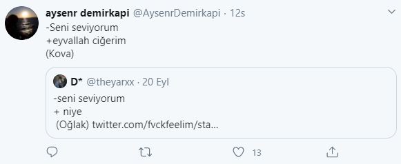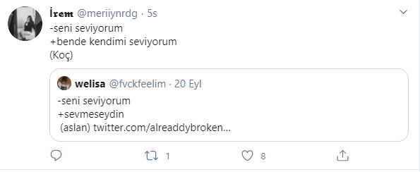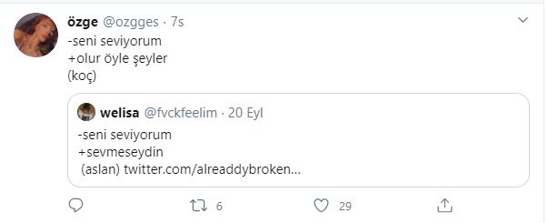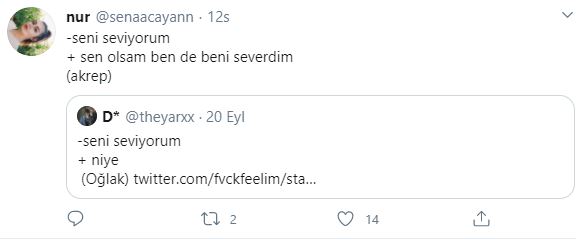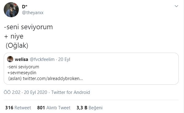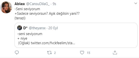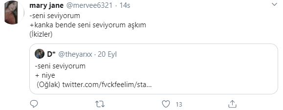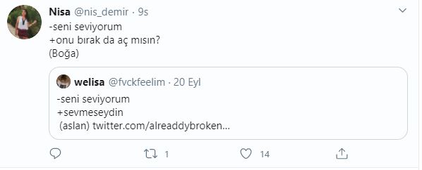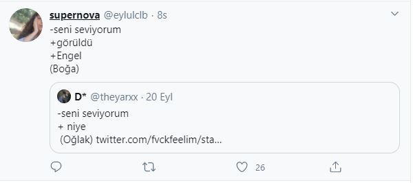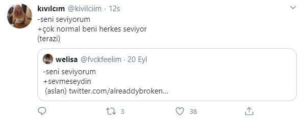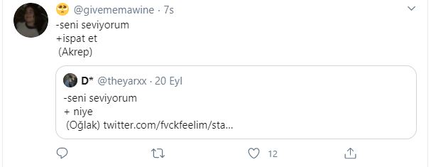 Twitter kullanıcıları 'seni seviyorum'' cümlesine burçlara göre karşılık verdiler, ortaya bir hayli eğlenceli yanıtlar çıktı. hangi cevapları vermişler gelin birlikte bakalım.