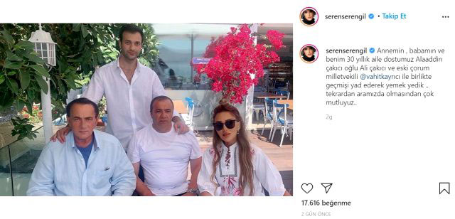 Serengil, paylaşımına 'annemin, babamın ve benim 30 yıllık aile dostumuz alaattin çakıcı oğlu ali çakıcı ve eski çorum milletvekili @vahitkayrıcı ile birlikte geçmişi yad ederek yemek yedik. tekrardan aramızda olmasından çok mutluyuz' notunu eklemişti.