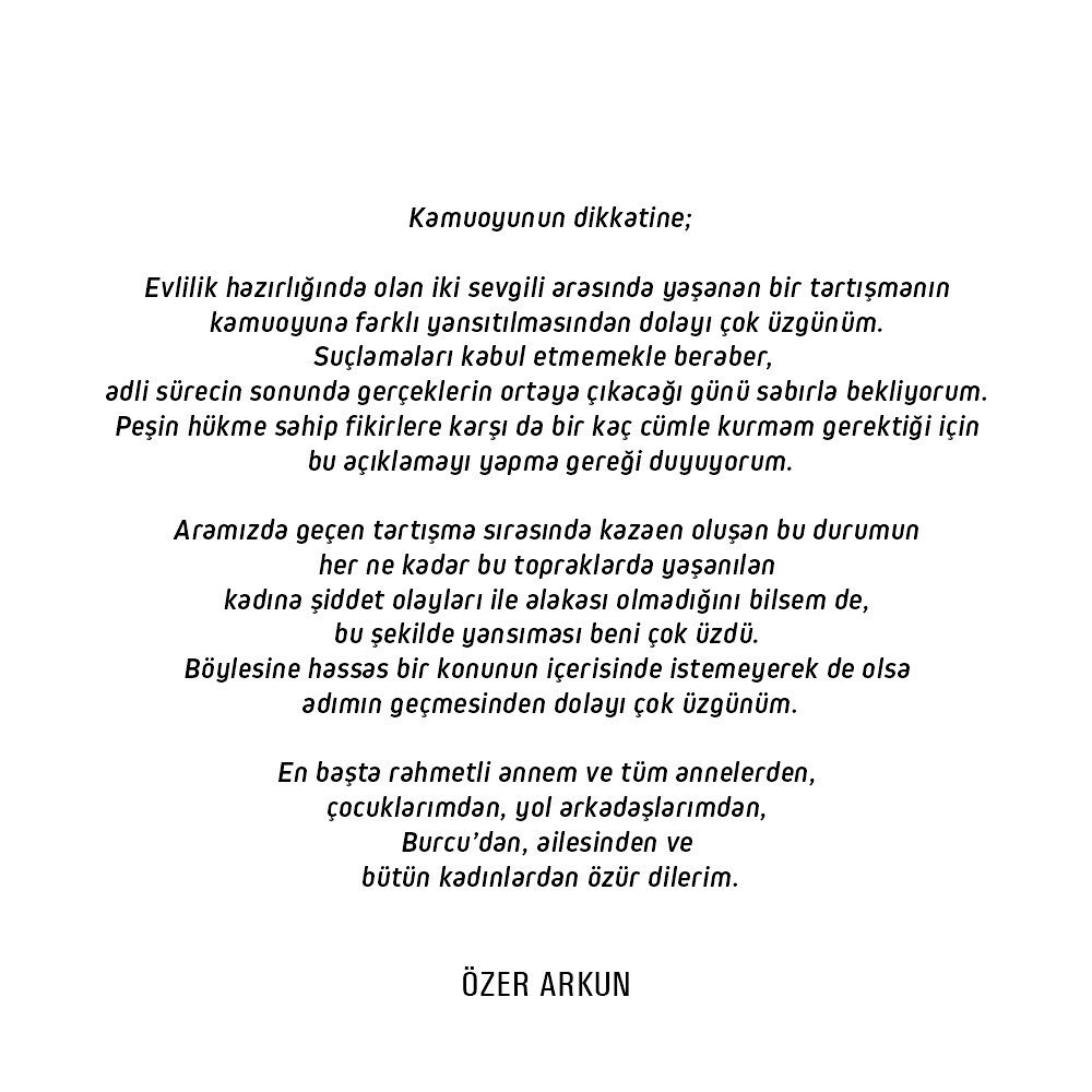 Böylesine hassas bir konunun içerisinde istemeyerek de olsa adımın geçmesinden dolayı çok üzgünüm. en başta rahmetli annem ve tüm annelerden, çocuklarımdan, yol arkadaşlarımdan, burcu’dan, ailesinden ve bütün kadınlardan özür dilerim’