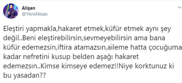 Alişan: “eleştiri yapmakla, hakaret etmek, küfür etmek aynı şey değil. beni eleştirebilirsin, sevmeyebilirsin ama bana küfür edemezsin, iftira atamazsın, aileme hatta çocuğuma kadar nefretini kusup belden aşağı hakaret edemezsin. kimse kimseye edemez. niye korktunuz ki bu yasadan?”