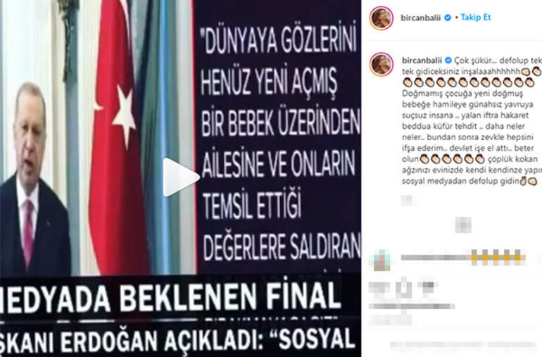 Bircan bali: “çok şükür. defolup tek tek gideceksiniz inşallah. doğmamış̧ çocuğa, yeni doğmuş̧ bebeğe, hamileye, günahsız yavruya, suçsuz insana... yalan, iftira, hakaret, beddua, küfür, tehdit. daha neler neler... bundan sonra zevkle hepsini ifşa ederim. devlet işe el attı. beter olun. çöplük kokan ağzınızı evinizde kendi kendinize yapın, sosyal medyadan defolup gidin"