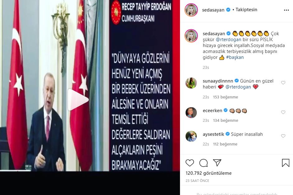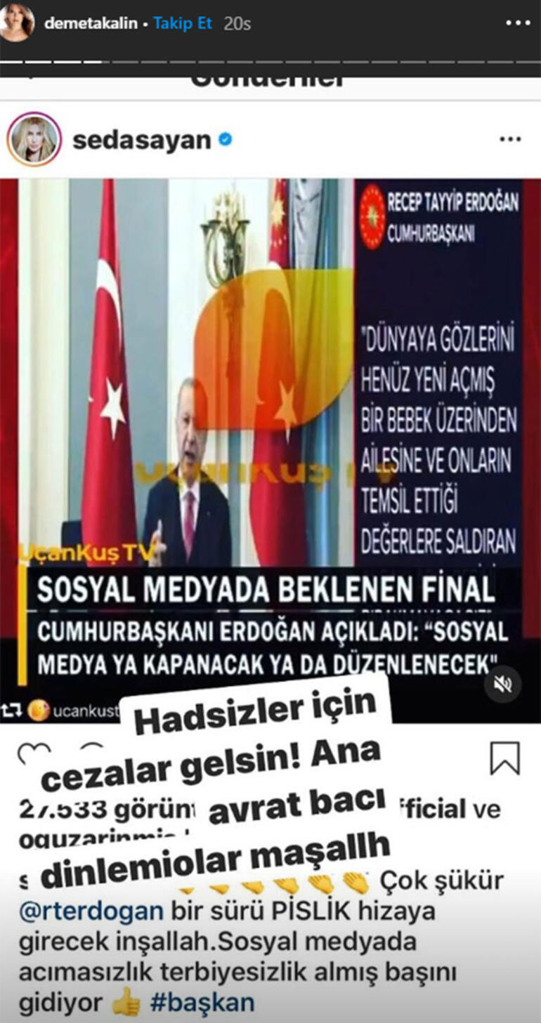 Seda sayan: “çok şükür recep tayyip erdoğan, bir sürü pislik hizaya girecek inşallah. sosyal medyada acımasızlık terbiyesizlik almış başını gidiyor”