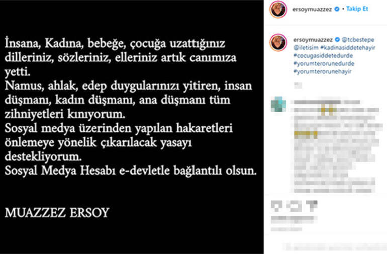 Muazzez ersoy: “insana, kadına, bebeğe, çocuğa uzattığınız dilleriniz, sözleriniz, elleriniz artık canımıza yetti. namussuz, ahlak, edep, duygularınızı yitiren, insan düşmanı, kadın düşmanı tüm zihniyetleri kınıyorum. sosyal medya üzerinden yapılan hakaretleri önlemeye yönelik çıkarılacak yasayı destekliyorum. sosyal medya hesabı, e-devlet'e bağlantılı olsun”