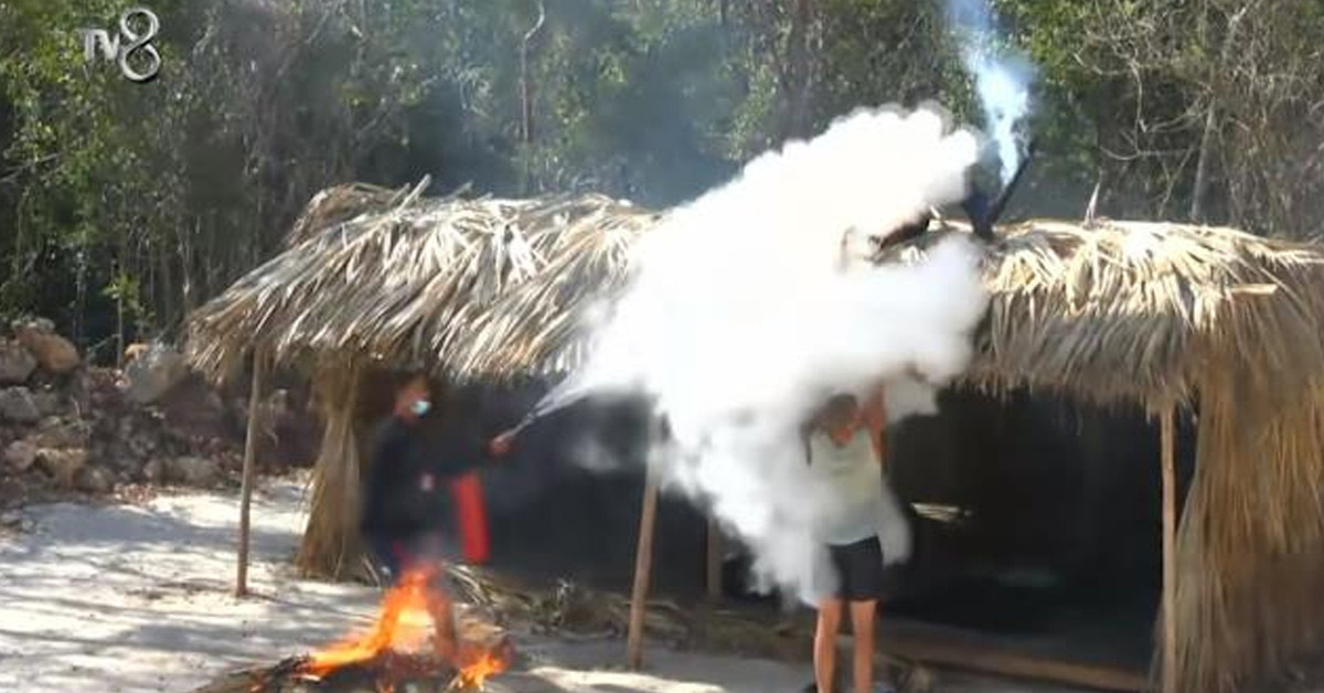 ''Burayı yakacağım" diye bağıran Yasin'e ise Survivor ekibinden bir görevli yangın tüpüyle müdahale ediyor. Yunus Emre ve Yasin'in elindeki ateş yangın tüpü sıkılarak söndürülüyor.