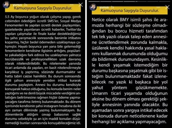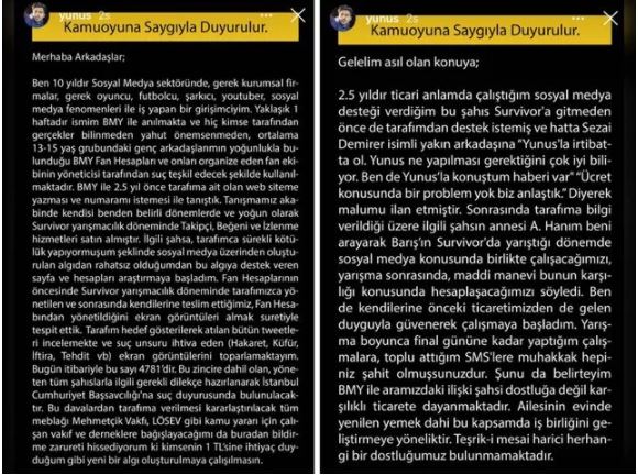 Yunus sedat aydın, barış murat yağcı'nın survivor boyunca kendisinden destek almak için anlaştığını fakat ödeme yapmadığını öne sürdü.