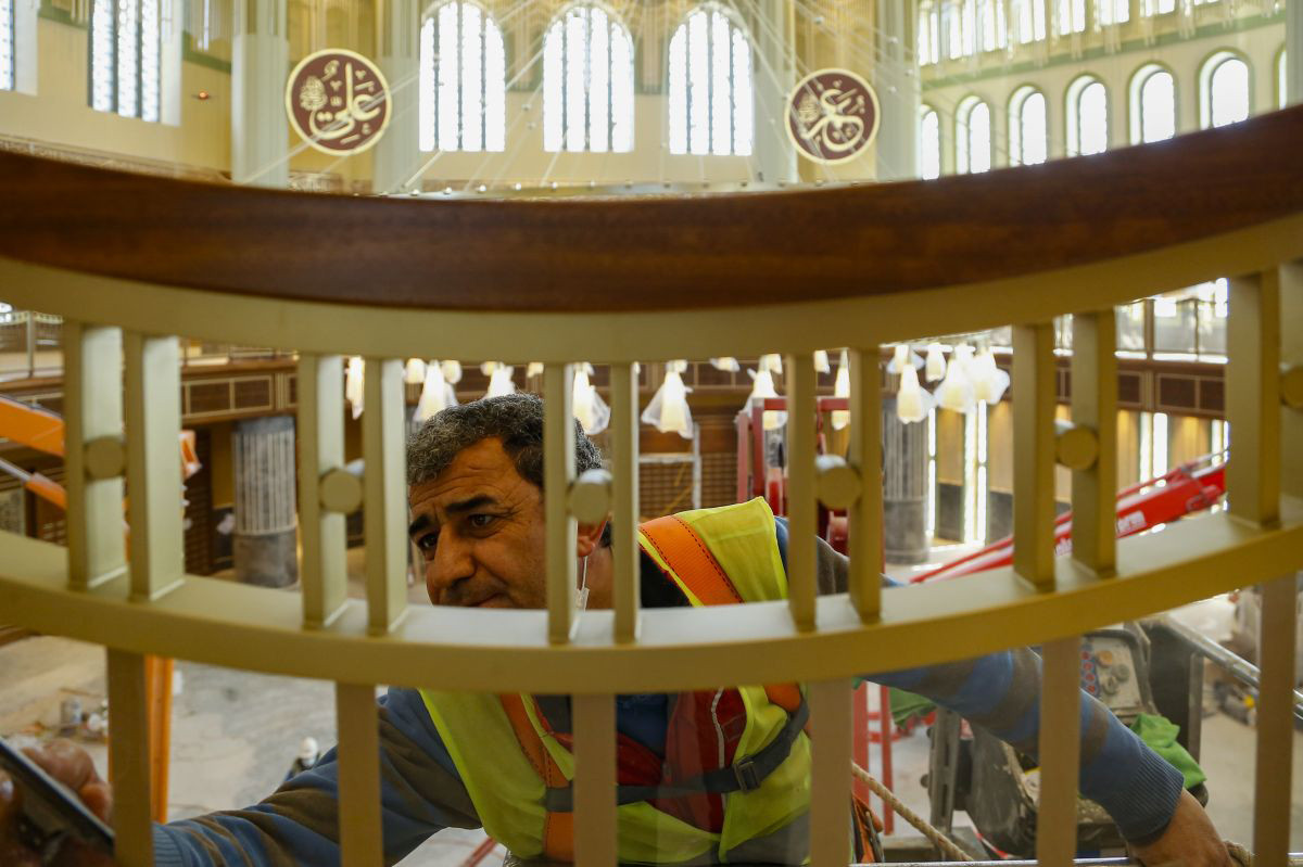 Öte yandan cami içine inşaat için kurulan iskeleler sökülüp, boyama işlemlerindeki ince işçiliğe geçildi. Namaz alanının ahşap duvar kaplamaları tamamlanırken, pencerelere ise korkuluklar takıldı.