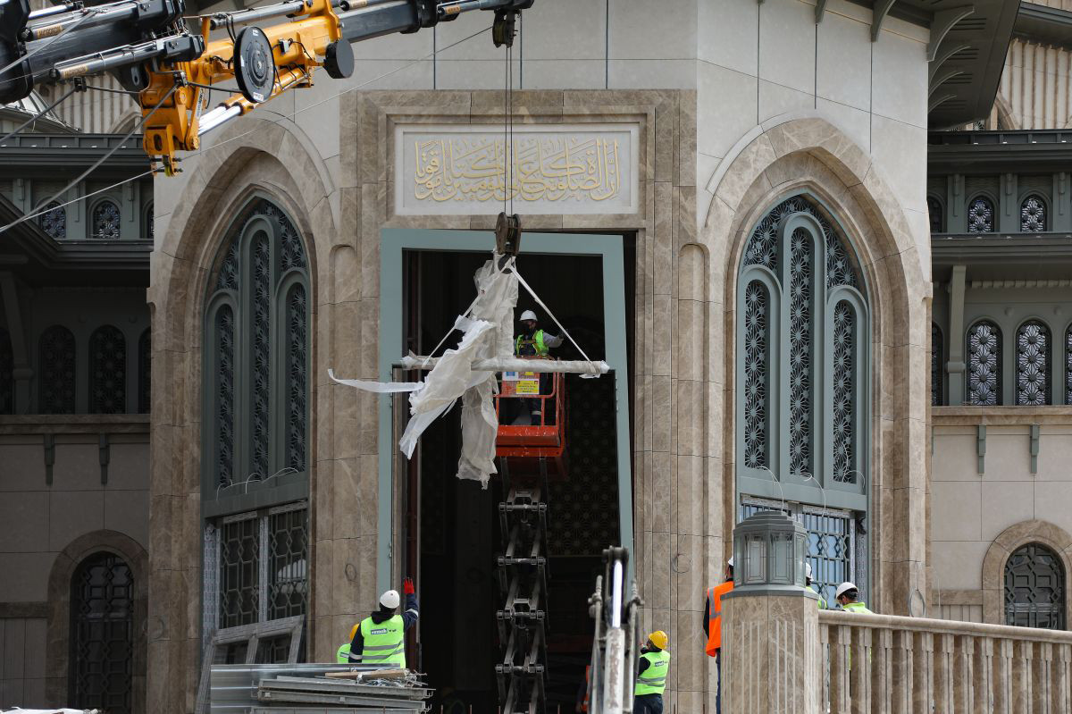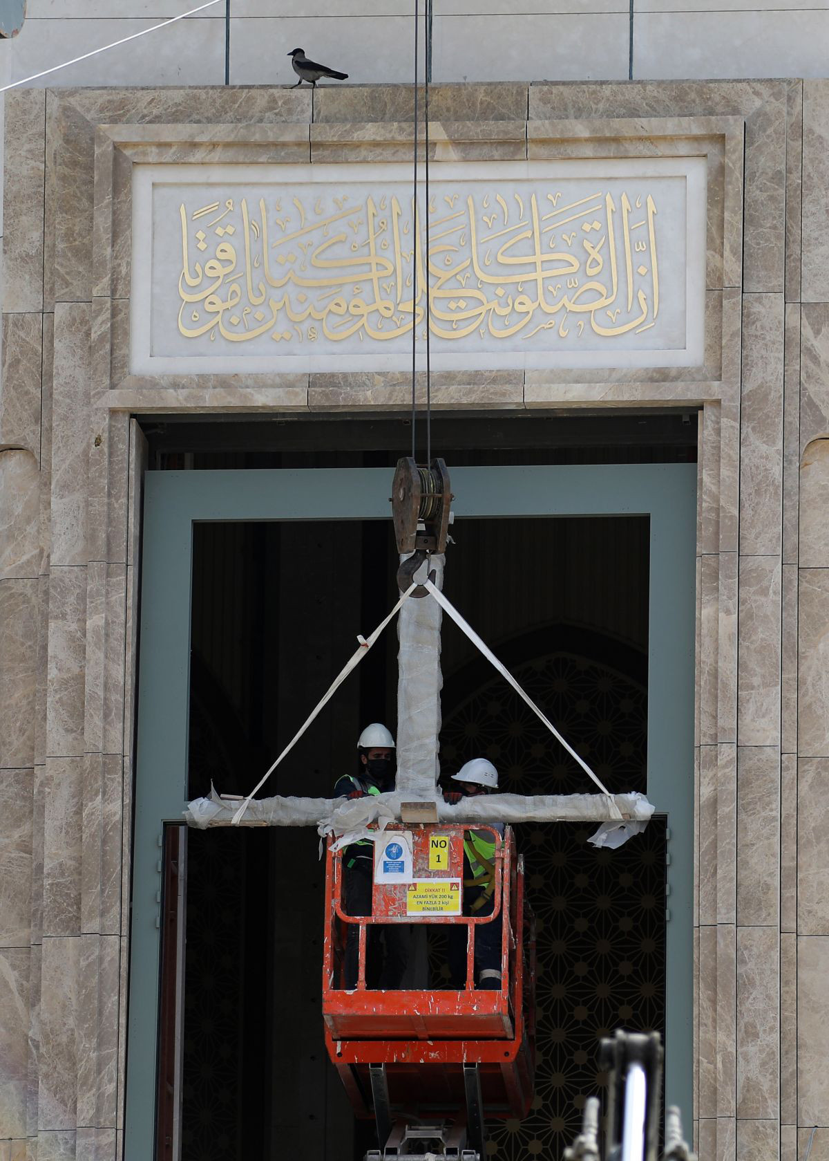 Caminin ana girişi için yapılan 7 metre yüksekliğinde, 3 metre enindeki çelik kapının kasası da takıldı. Kamyonla getirilen kasa, vinçle indirildikten sonra kalabalık bir ekip tarafından yerine monte edildi.