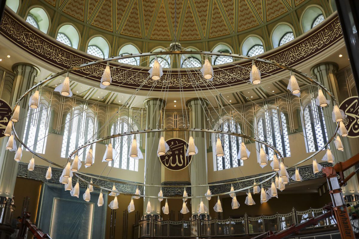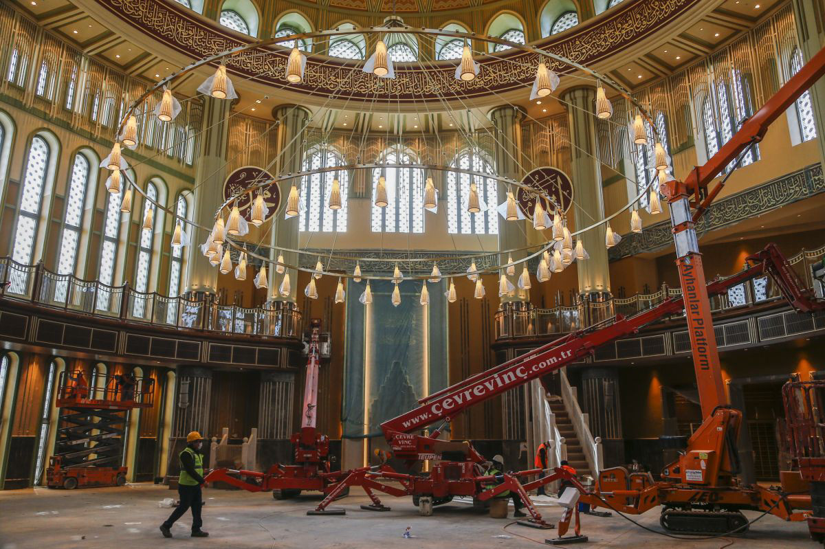 Taksim Camii’sinin son olarak 12 metre çapında, 20 metre yüksekliğindeki 60 ışıklı devasa avizesi takılarak, avizenin elektrik testleri yapıldı.