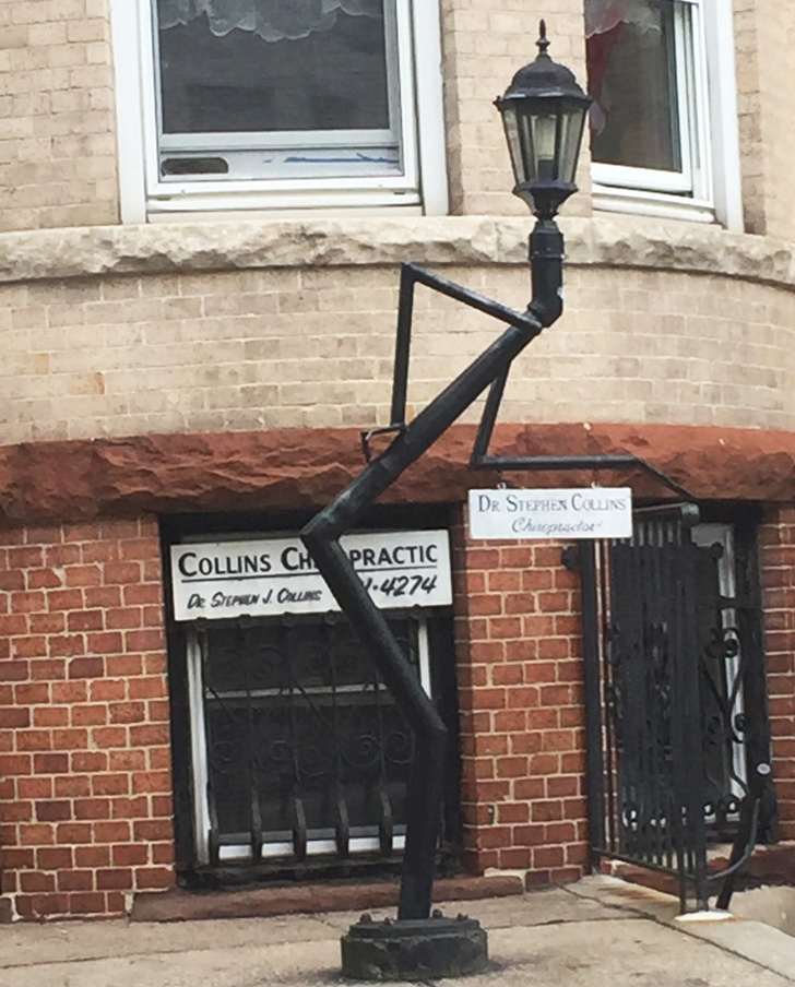 Bir chiropractor ofisinin önünde eğilen bu elektrik direği.