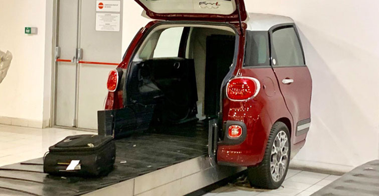 Bu bagaj taşıma bandı bir arabanın bagajından geçer.