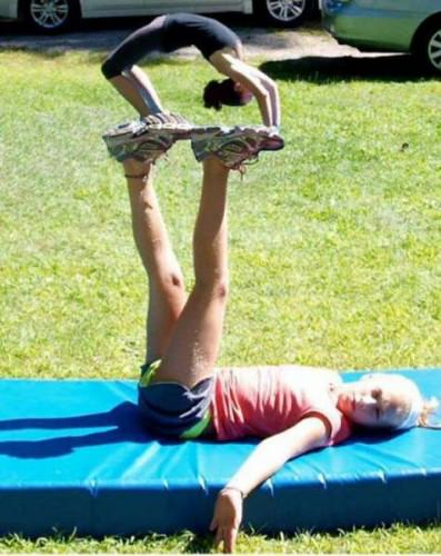 Esneme hareketi yapan kadının ayaklar üstünde havalanmış gibi gözükmesi.