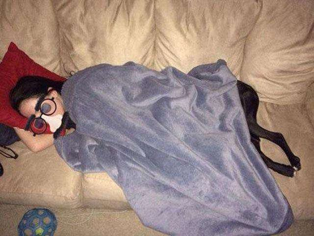 Uyuyan kişinin arkasına köpeğin de yatmasıyla kafası insan, ayakları köpek görüntüsünün ortaya çıkması