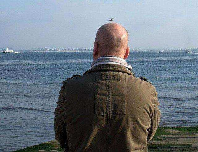 Adamın kafasının üstüne kuş konmuş gibi görünmesi.