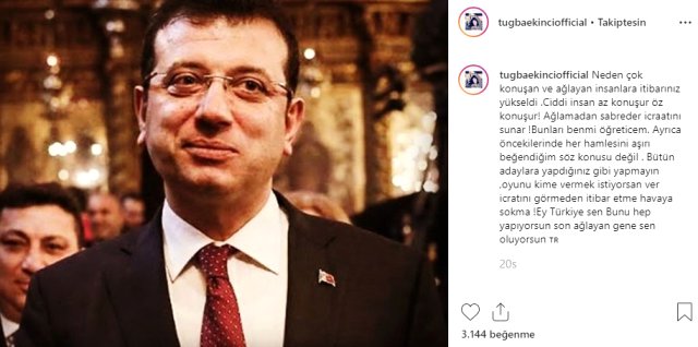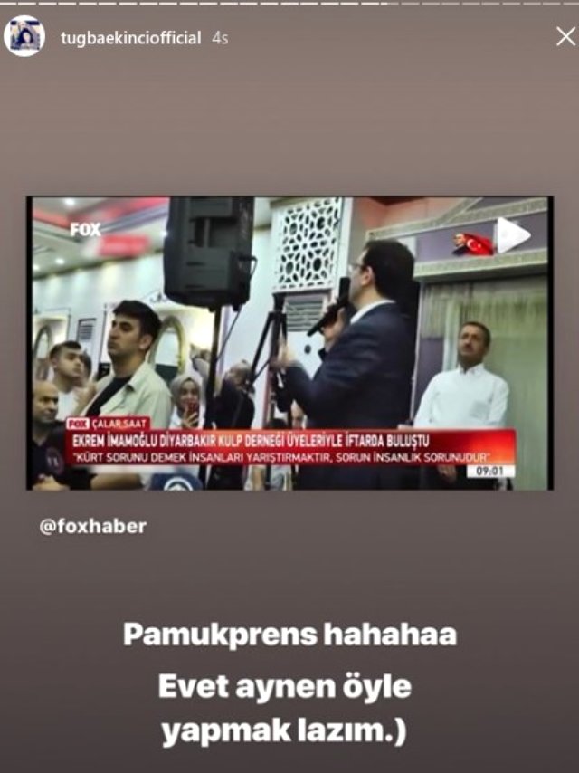 Tuğba ekinci daha sonra ınstagram hesabının hikaye bölümünden imamoğlu'nun fotoğrafını paylaşarak tiye aldı.