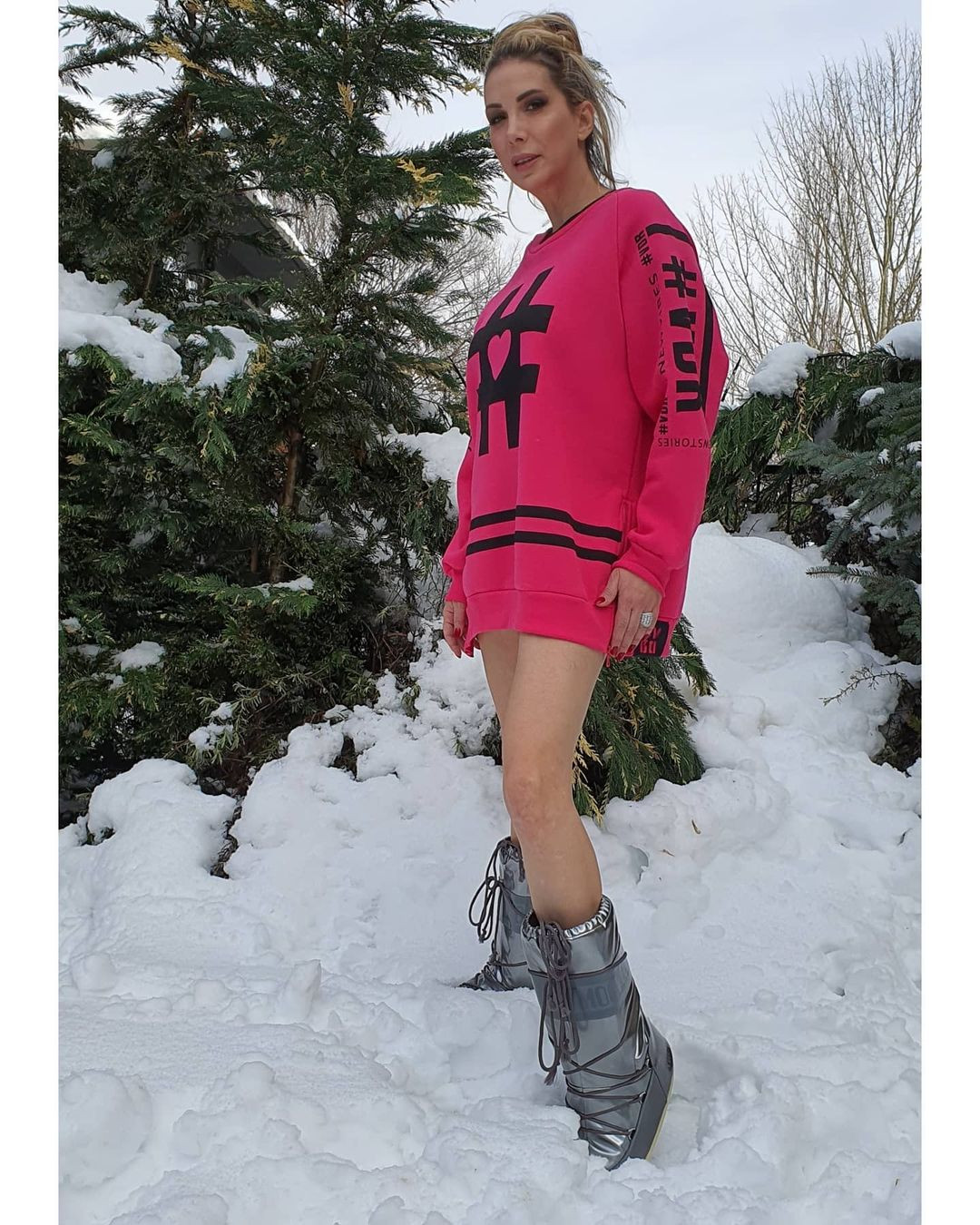 Söz konusu paylaşımda Tuğba Özerk’in pembe sweetinin altına tayt giydiği ve kar pozu vermek için taytını çıkardığı ortaya çıktı.
