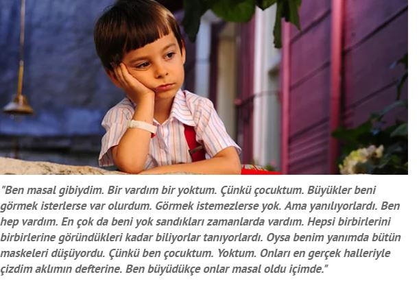 Öyle bir geçer zaman ki ‘ben masal gibiydim. bir vardım bir yoktum. çünkü çocuktum. büyükler beni görmek isterlerse var olurdum. görmek istemezlerse yok. ama yanılıyorlardı. ben hep vardım. en çok da beni yok sandıkları zamanlarda vardım. hepsi birbirlerini birbirlerine göründükleri kadar biliyorlar tanıyorlardı. oysa benim yanımda bütün maskeleri düşüyordu. çünkü ben çocuktum. yoktum. onları en gerçek halleriyle çizdim aklımın defterine. ben büyüdükçe onlar masal oldu içimde.’