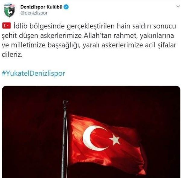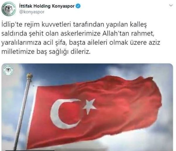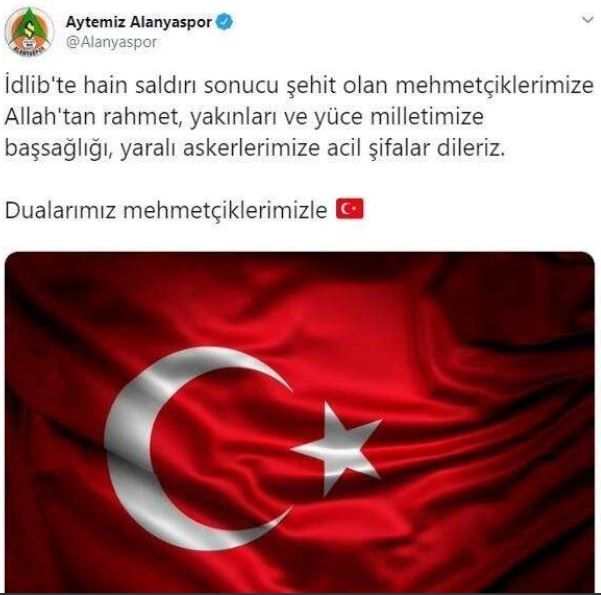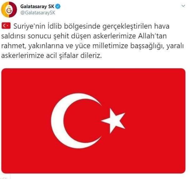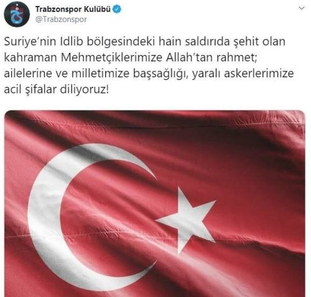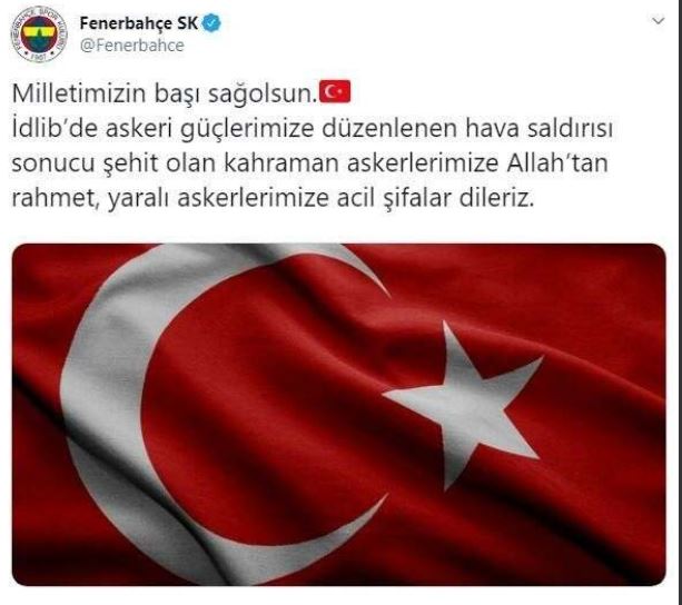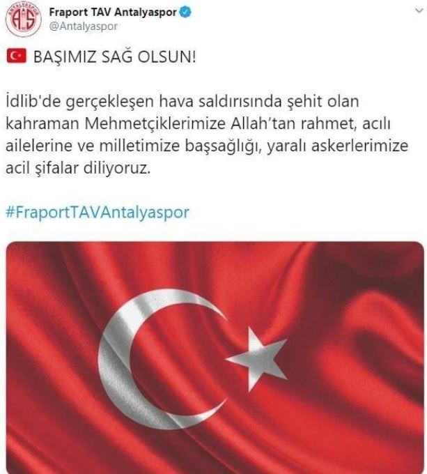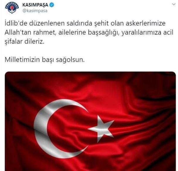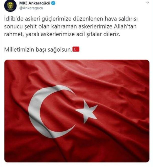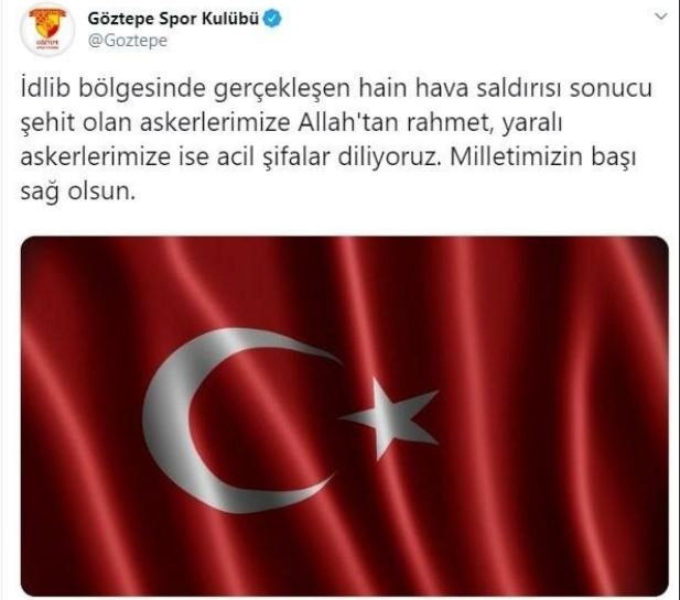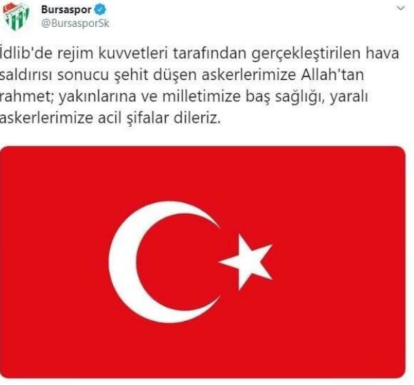 İdlib’de askeri güçlerimize düzenlenen hava saldırısı sonucu şehit olan kahraman askerlerimize allah’tan rahmet, yaralı askerlerimize acil şifalar dileriz. milletimizin başı sağolsun.