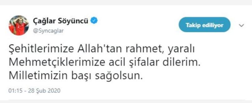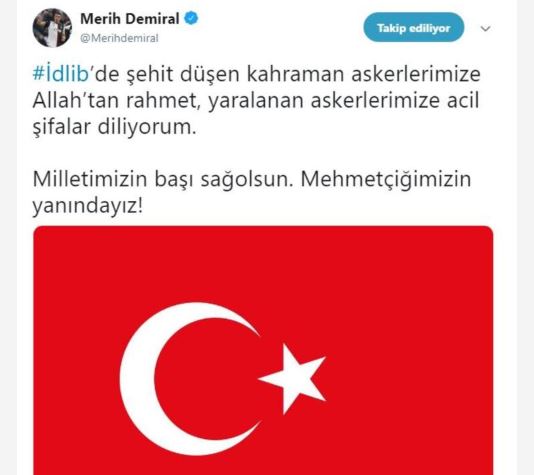 İdlib’de şehit düşen kahraman askerlerimize allah’tan rahmet, yaralanan askerlerimize acil şifalar diliyorum. milletimizin başı sağolsun. mehmetçiğimizin yanındayız!