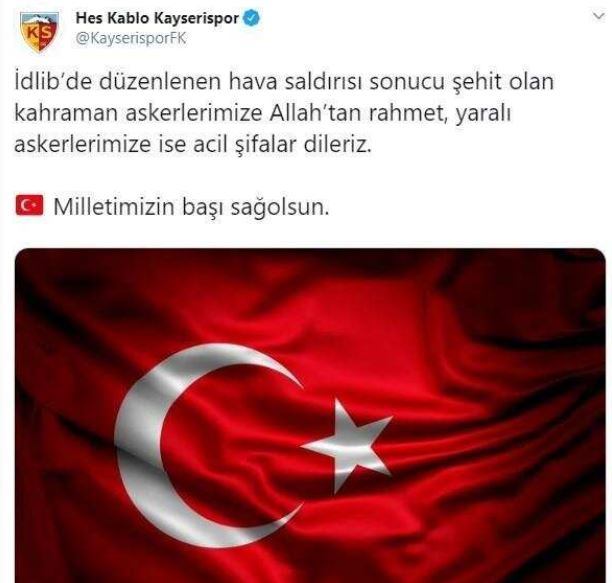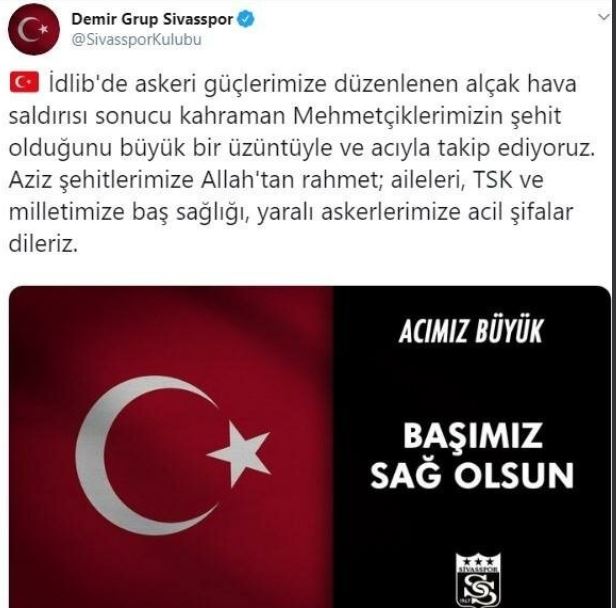 İdlib’de düzenlenen hava saldırısı sonucu şehit olan kahraman askerlerimize allah’tan rahmet, yaralı askerlerimize ise acil şifalar dileriz. milletimizin başı sağ olsun.