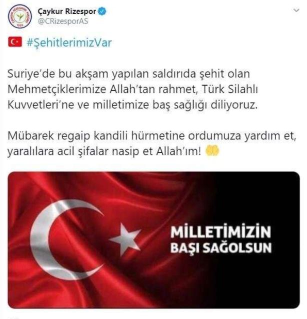 Suriye’de bu akşam yapılan saldırıda şehit olan mehmetçiklerimize allah’tan rahmet, türk silahlı kuvvetleri’ne ve milletimize baş sağlığı diliyoruz. mübarek regaip kandili hürmetine ordumuza yardım et, yaralılara acil şifalar nasip et allah’ım!