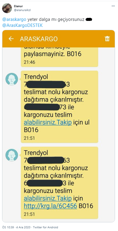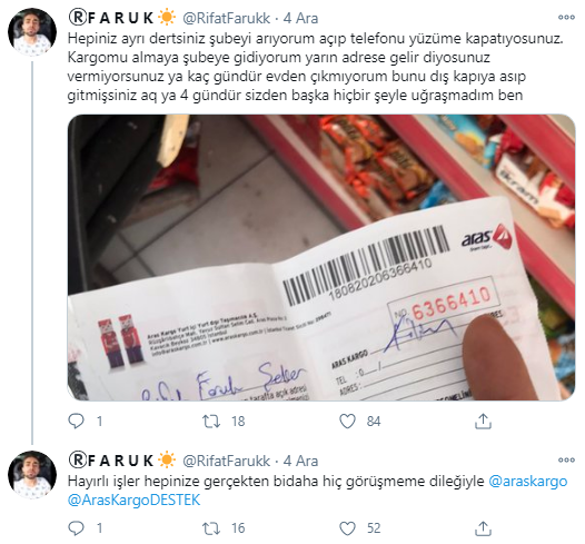 Aras Kargo'nun siparişlerimize gösterdiği özeni yansıtan bir görsel ile sonlandırıyoruz... Biz bu şikayetlerin sadece bir kaçını paylaştık... Sizde yaşadıklarınızı paylaşabilirisiniz....