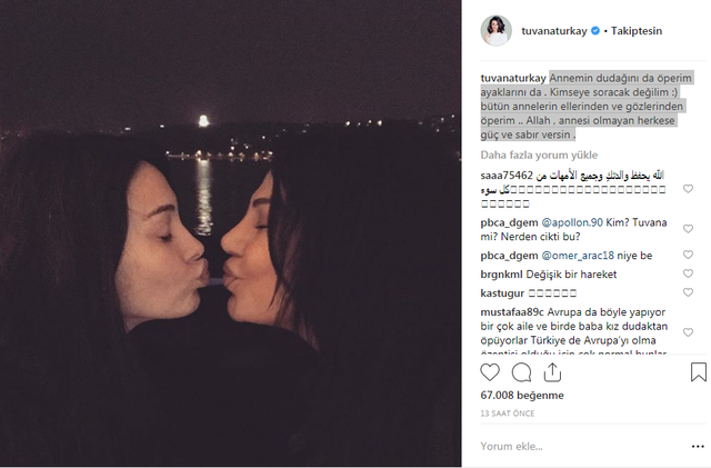 Ünlü oyuncu, paylaşımına 'annemin dudağını da öperim ayaklarını da. kimseye soracak değilim. bütün annelerin ellerinden ve gözlerinden öperim. allah, annesi olmayan herkese güç ve sabır versin.' notunu ekledi.
