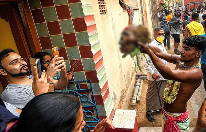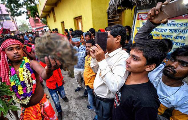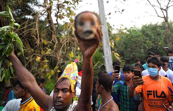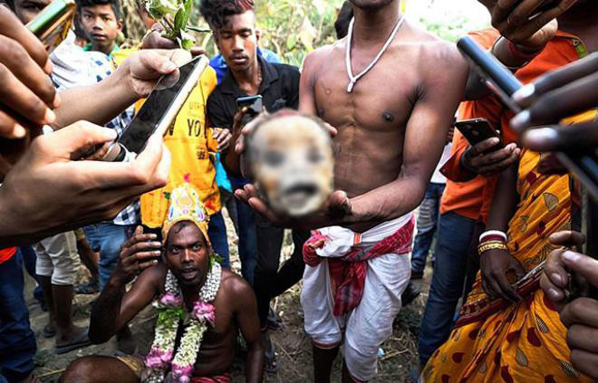 Hindistan'ın Bardhaman bölgesinde yaşayan insanlar, tanrılarını mutlu etmek için mezardan çıkardıkları insan kafatası ile caddelerde dans ediyorlar.