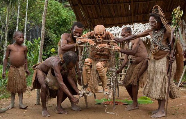 Papua Yeni Gine'de ölü erkek, kadın ve çocuklar, tütsülenmiş ringa balığı pişirme tekniğiyle aynı işleme tabi tutuluyor. İlk olarak deneyimli mumyalayıcılar kadavraların ayak, diz ve dirseklerinde vücuttaki yağın akması için kesikler açıyor ve bamboo direklerini bağırsaklarına sokarak kalan damlaları topluyor. Bu yağ, cesedin yaşayan yakınlarının ciltlerine ve saçlarına sürülüyor böylece ölünün gücünün yaşayana geçeceğine inanılıyor. Geri kalanı da aynı sebeple yemek yağı olarak kullanılıyor.